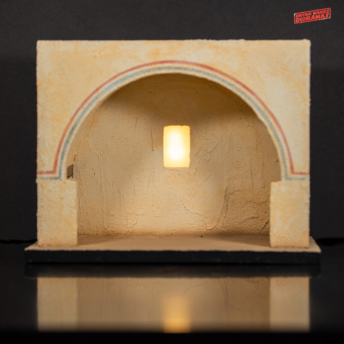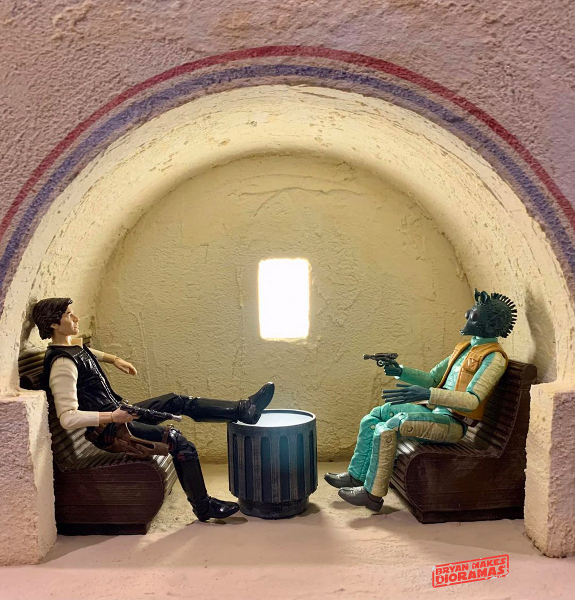 12th-scale diorama of the alcove in the Mos Eisley cantina where Han Solo shot Greedo. Made from foam and plaster and painted to look like the interior of the Mos Elsley Cantina. Toy Furniture was created by Haase Customs.
