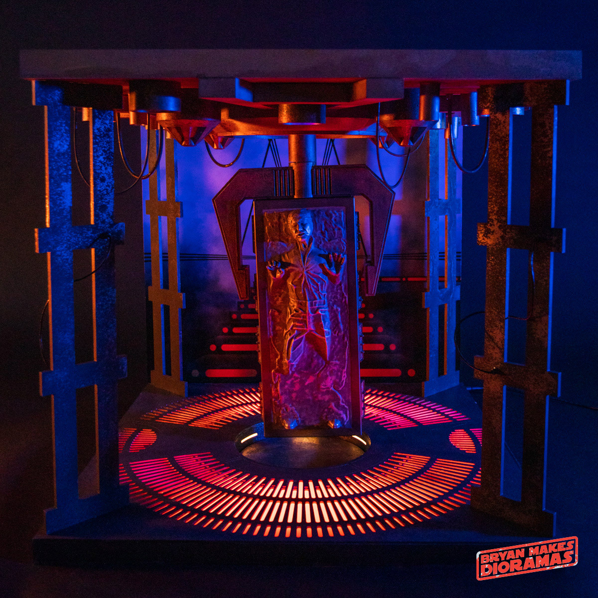 Sixth-scale diorama depicting the carbon freezing chamber scene from Empire Strikes Back. Designed in Adobe Illustrator and Fusion 360. Background was build in Adobe Illustrator and Photoshop. Built using laser cut acrylic, 3D printed parts and LED lights. Diorama is original except for the Han in Carbonite figure.